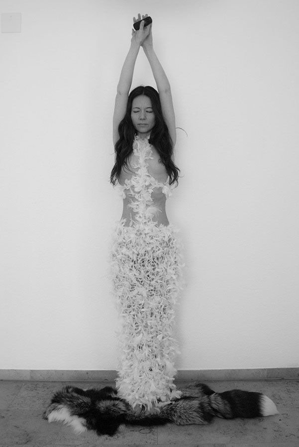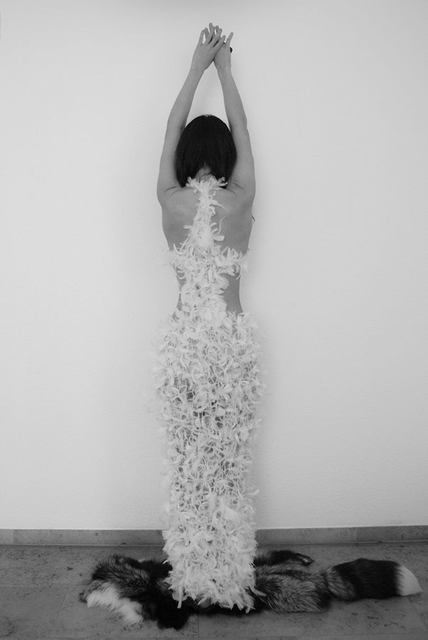As opposed to the net, the robe made of feathers and the liberating posture represent the desire to be as light as a bird and to free myself from all existential constraints. This desire can be understood as a component of both human and animal instinct. The connection to the animal world is shown in the image through a wolf that lies on the floor.